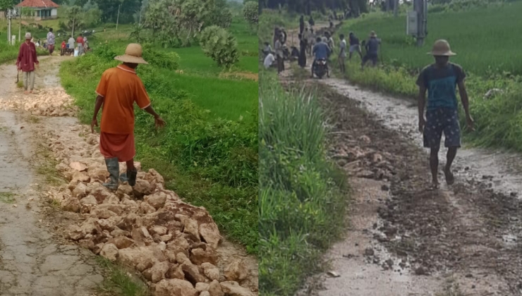 Setelah hampir delapan tahun tanpa sentuhan perbaikan dari pemerintah desa, masyarakat setempat memilih turun tangan sendiri memperbaiki jalan rusak yang menjadi akses vital antar dusun.